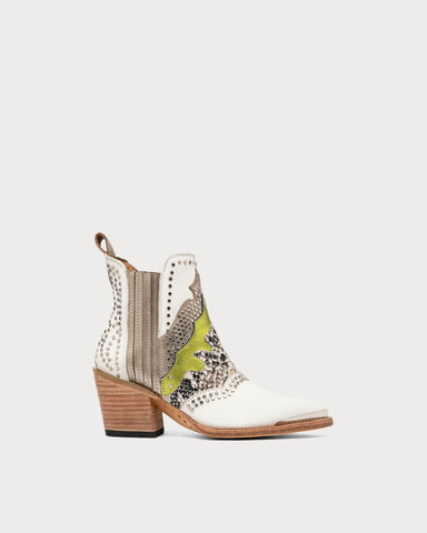 - Women's black leather ankle boots in leather with metallic stud applications, white wrinkled leather, black baby pony leather and lateral elastics, leather western heel and narrow toe box.