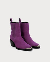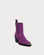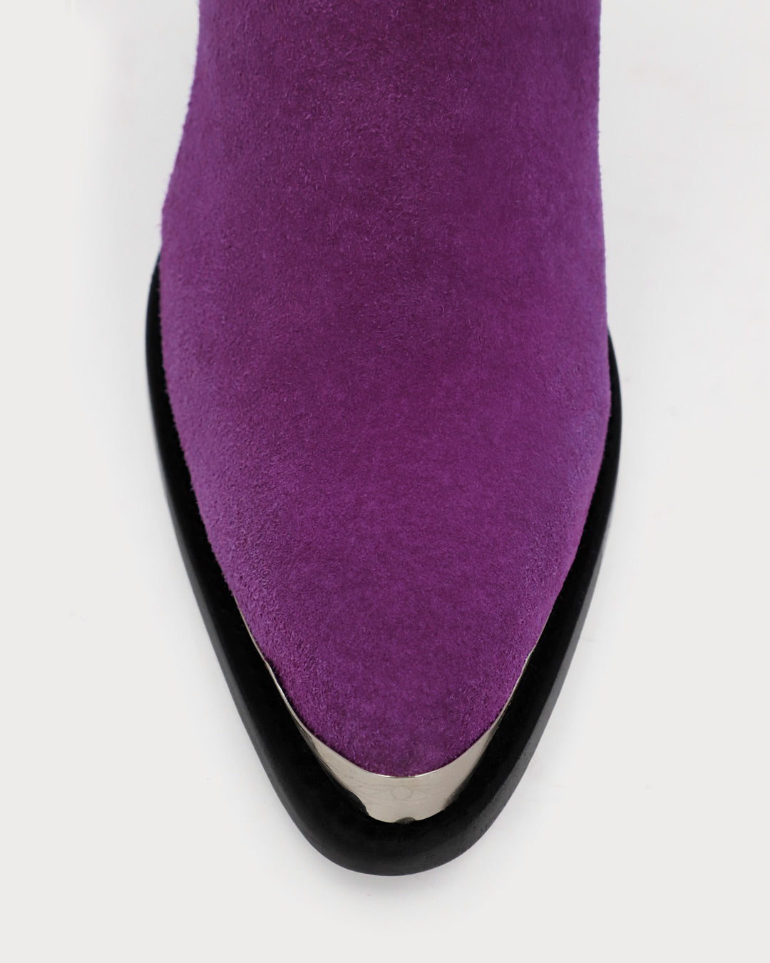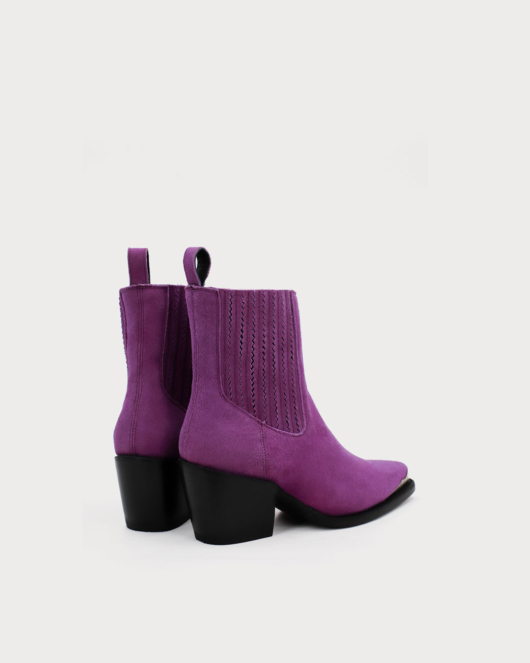 This version in purple suede redefines the shape with bold presence, elevated by a contrasting black sole and heel. The soft, flexible suede offers comfort from the first wear, while the metal toe cap adds a sharp finishing detail.The natural wood heel provides stability without sacrificing height. A side gusset at the shaft makes it easy to pull on and supports daily use. Handmade in Mexico, Aria Purple is made to move.