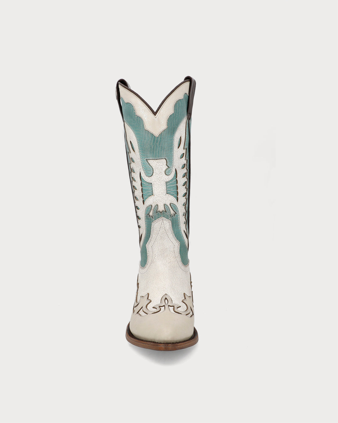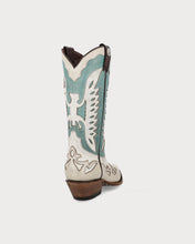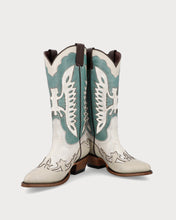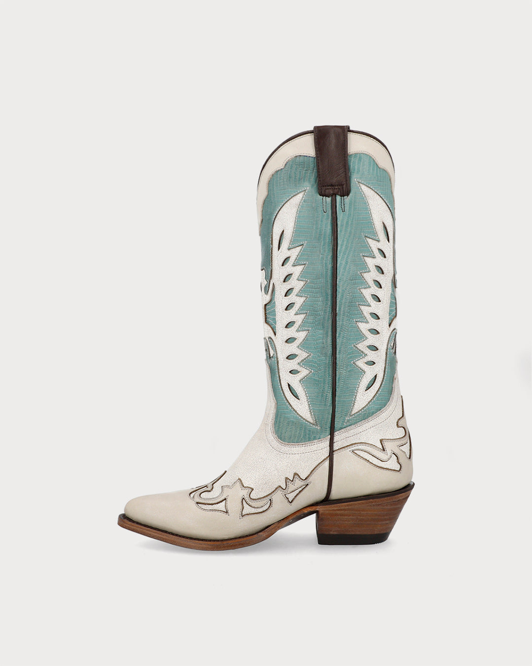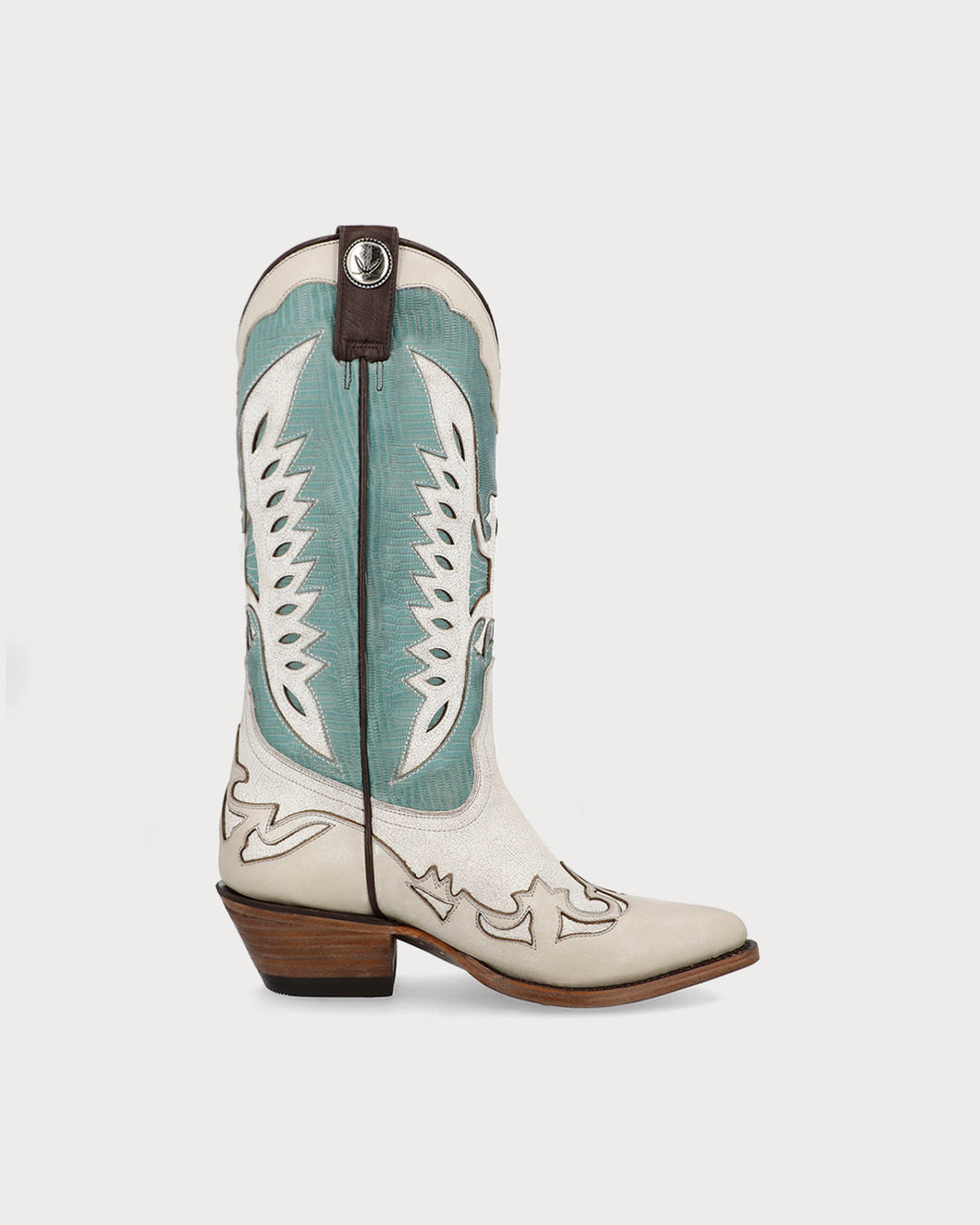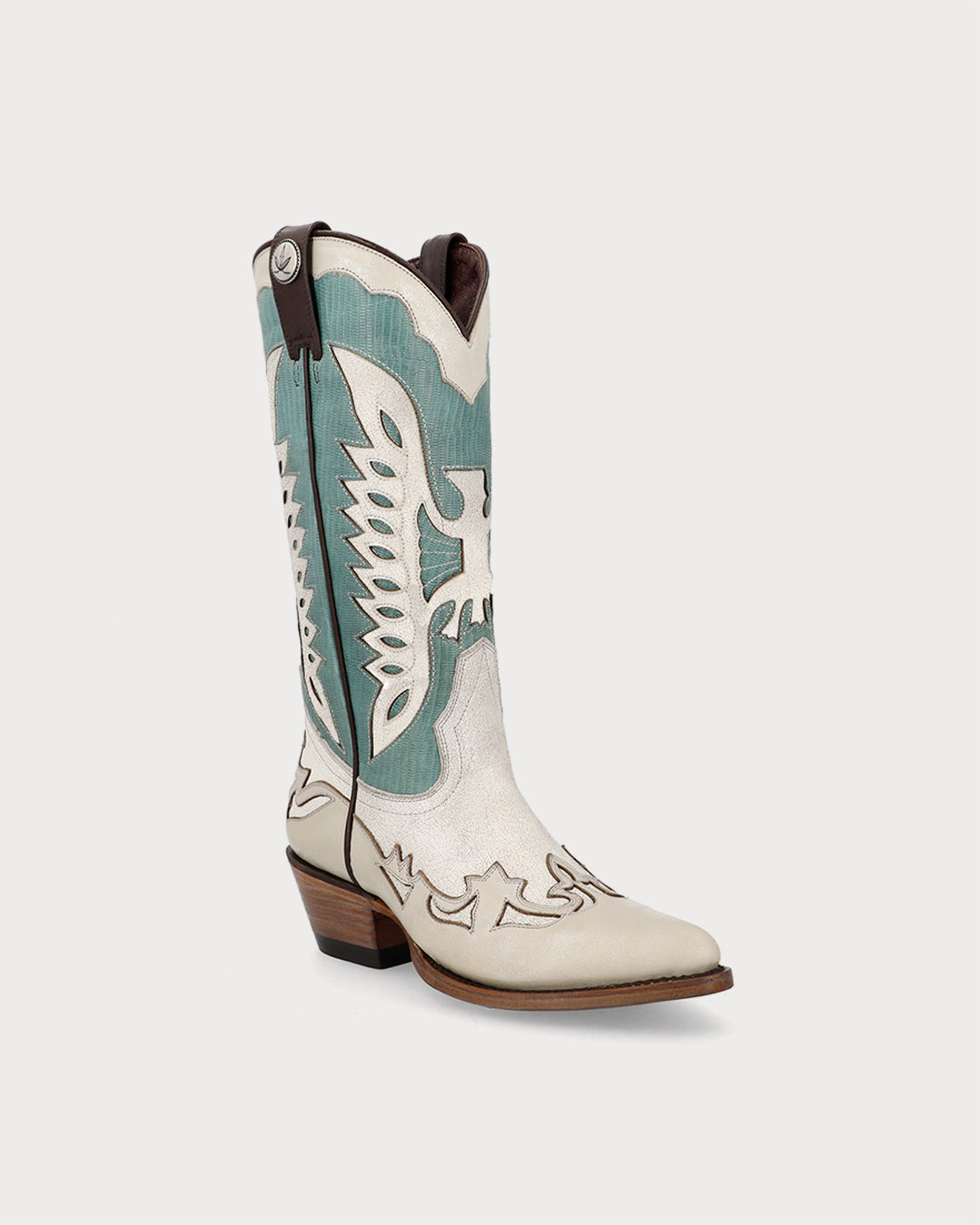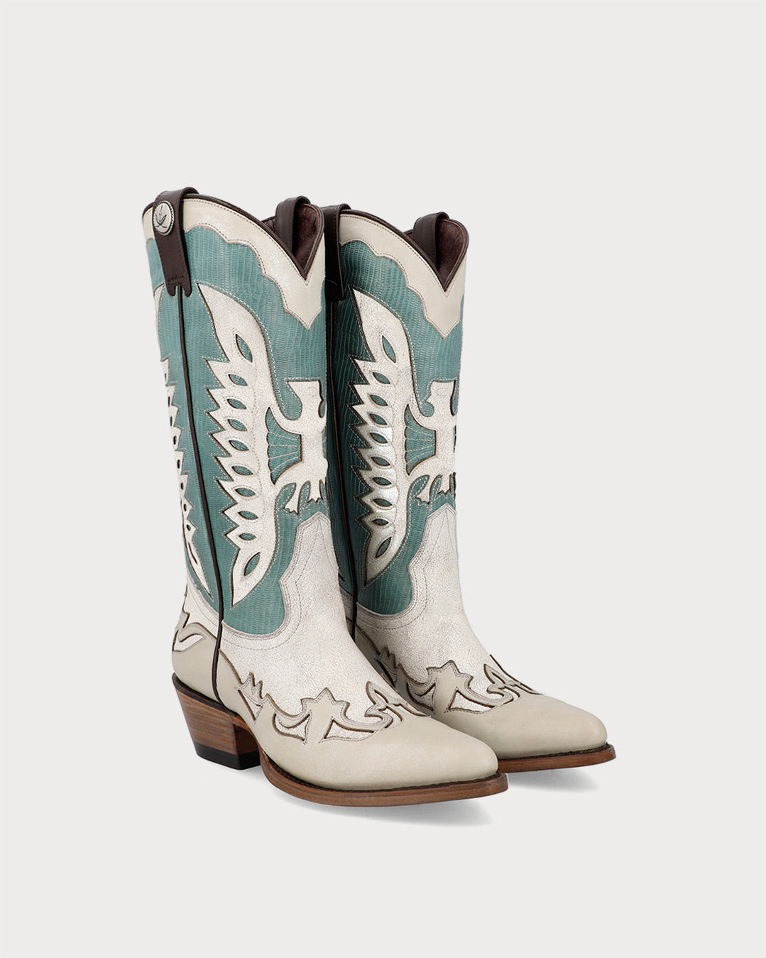 - High western boots with aqua detailing set against a light base.