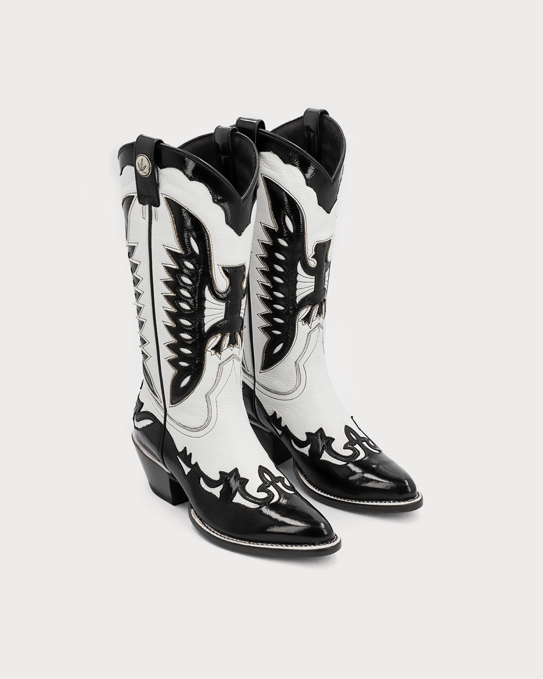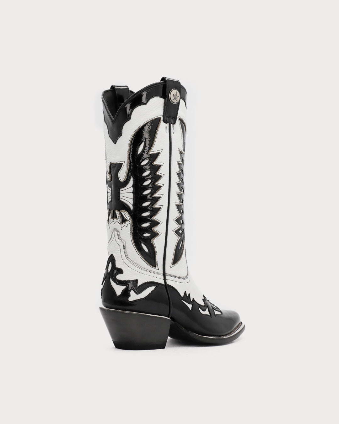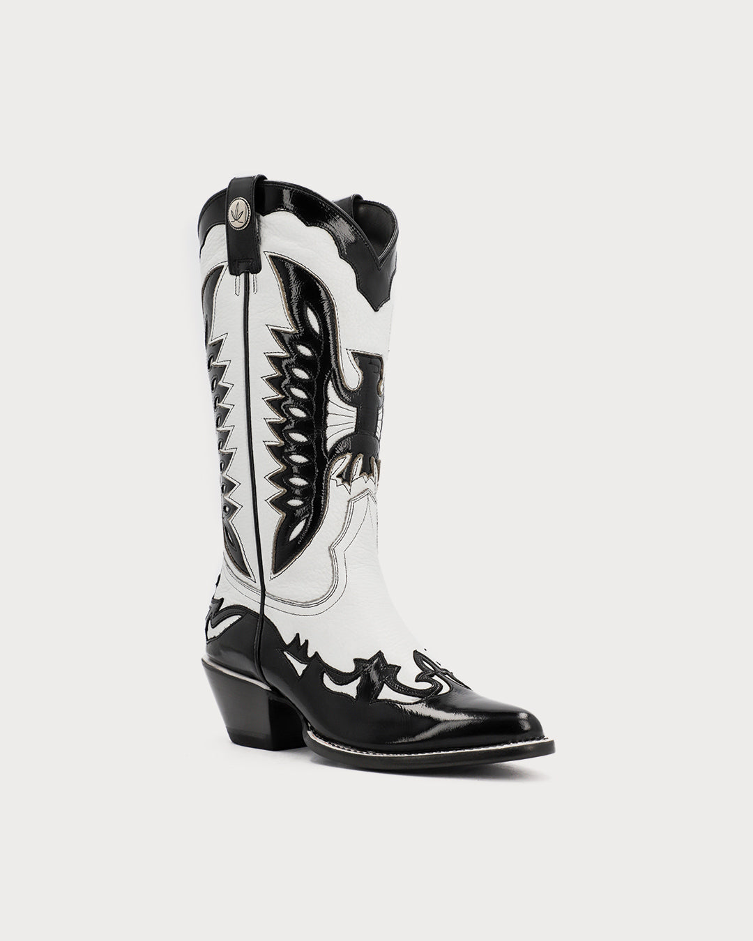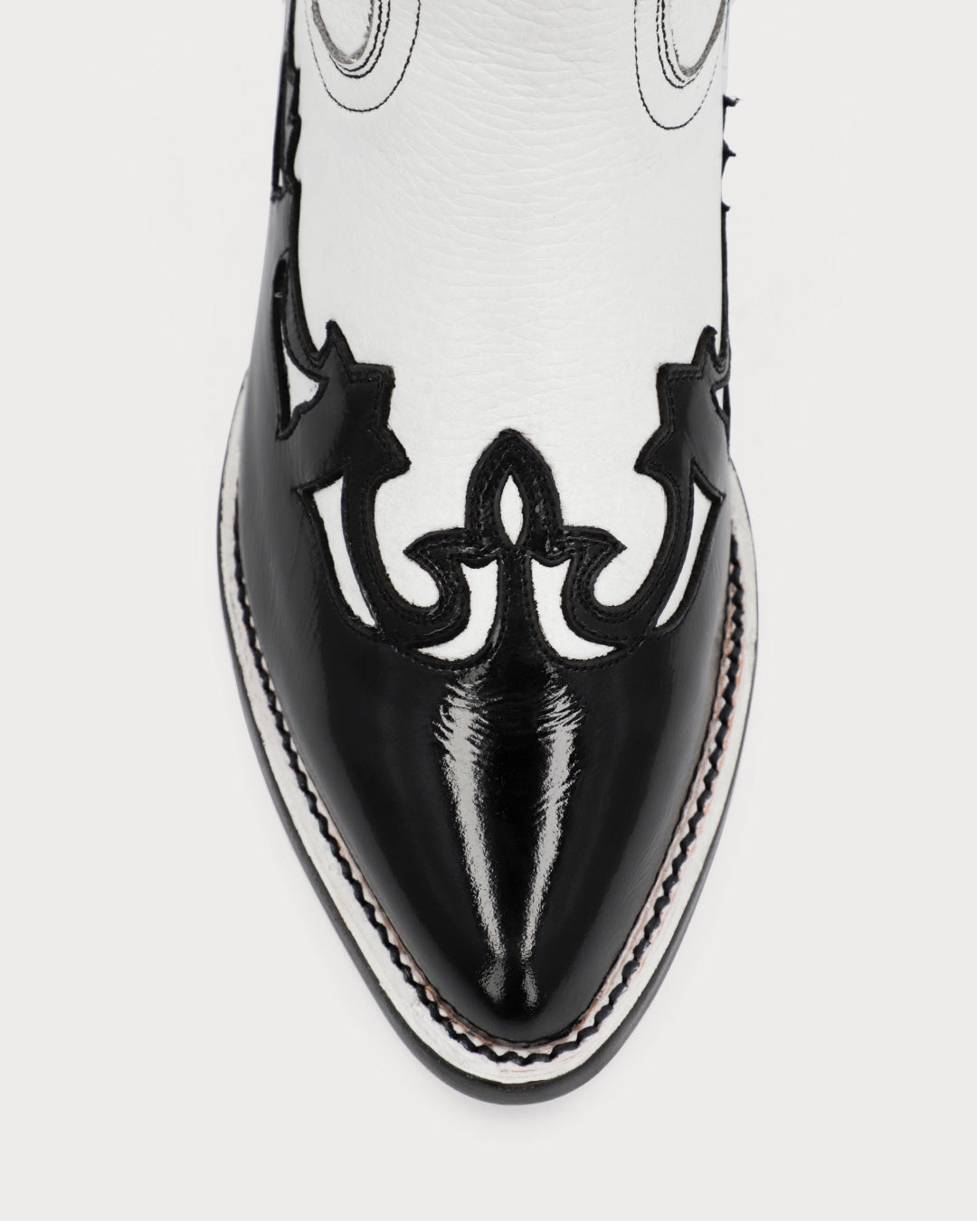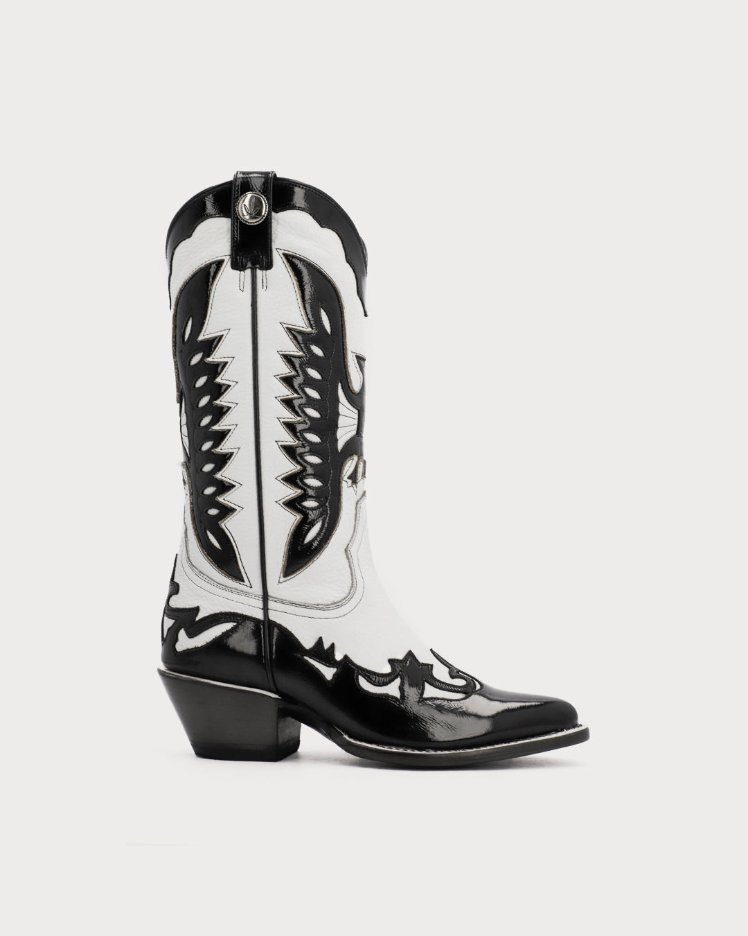 Women’s boot in a white & black combination, featuring a glossy finish on the black leather.