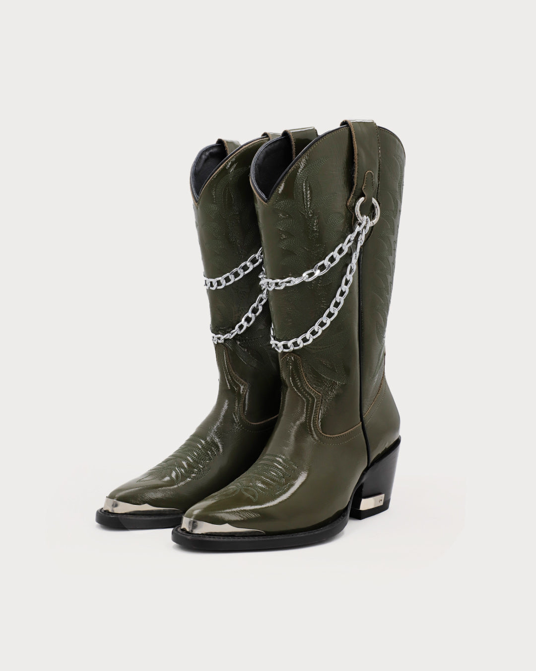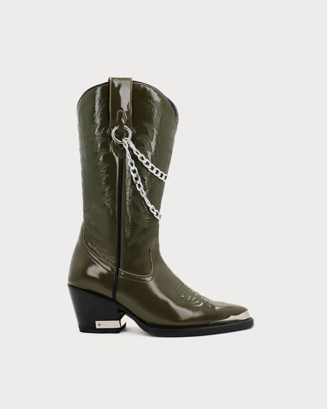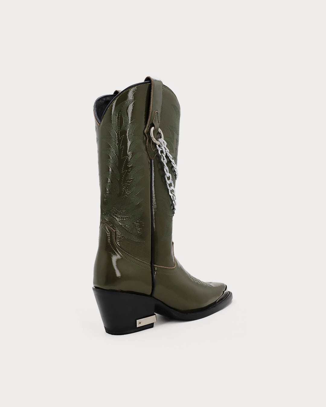 Women’s olive boots with removable double-chain hardware on the pull tabs, traditional shaft embroidery, pointed toe, metal heel plate, and glossy finish.