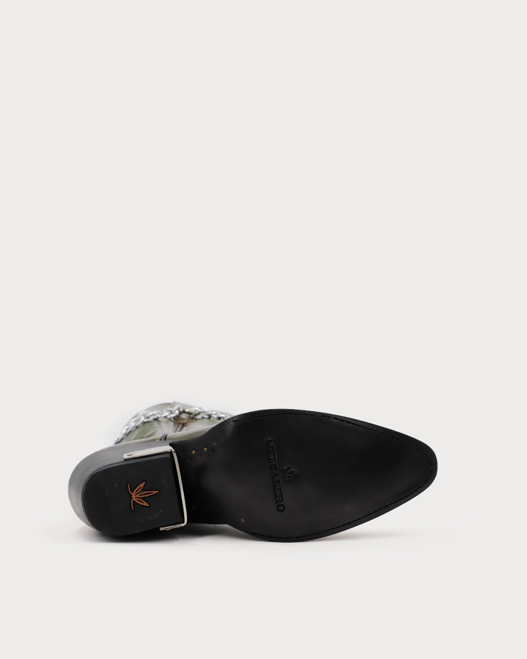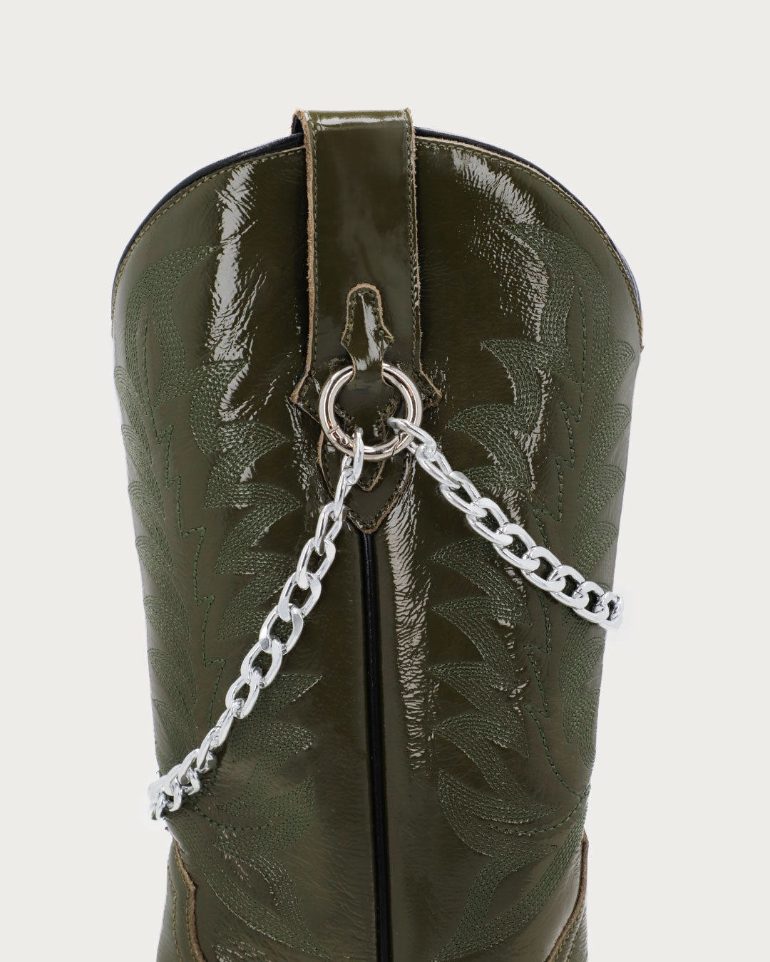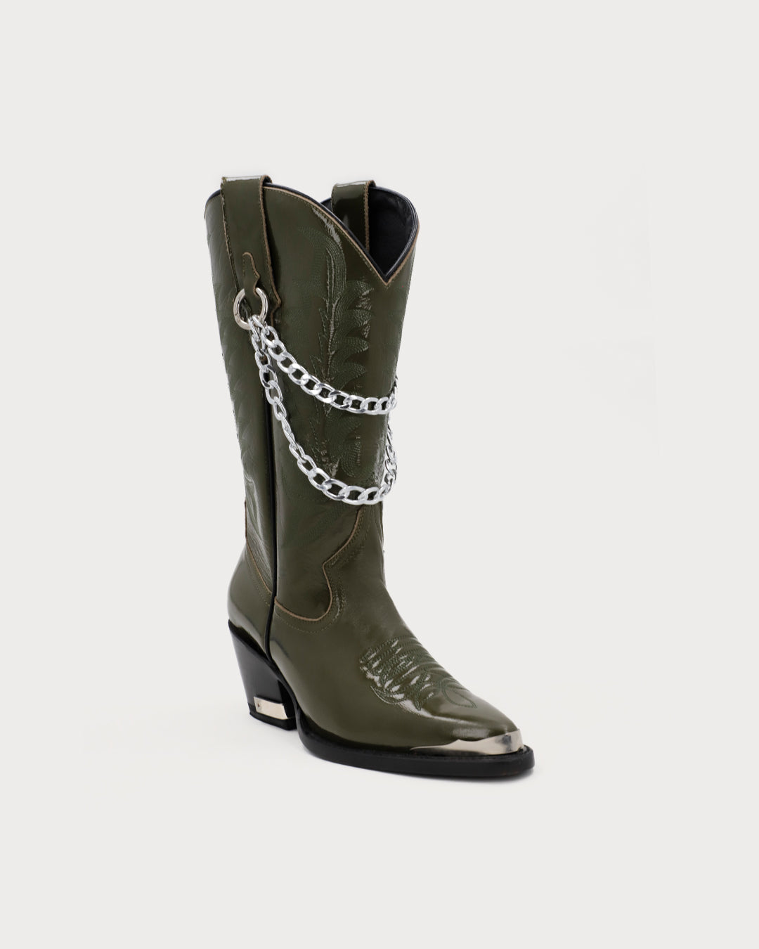 Women’s olive boots with removable double-chain hardware on the pull tabs, traditional shaft embroidery, pointed toe, metal heel plate, and glossy finish.