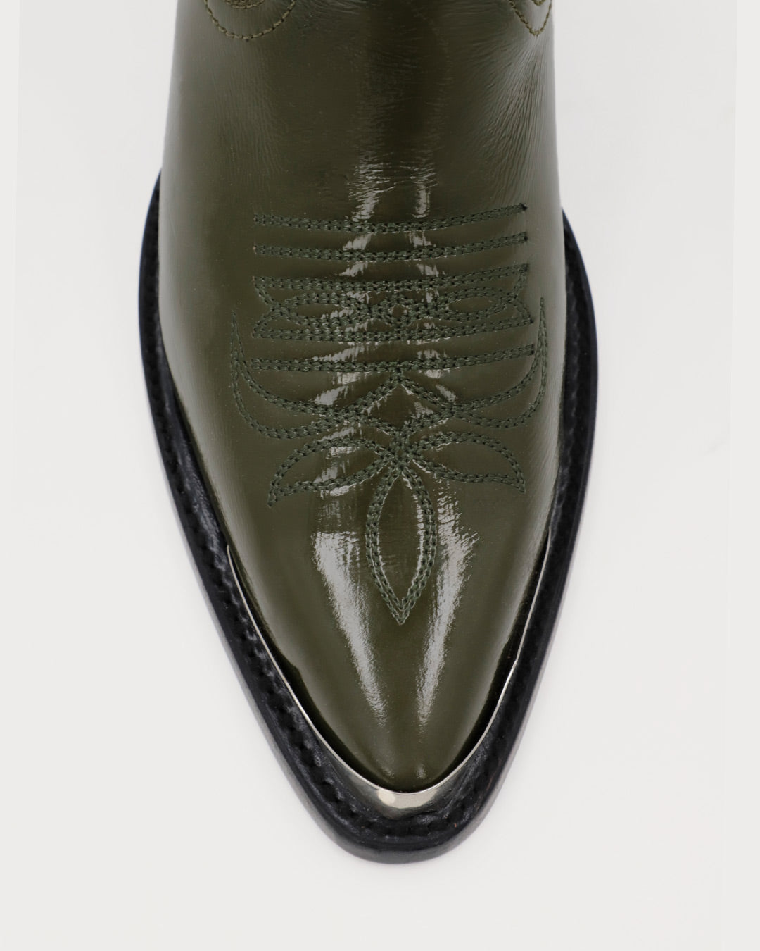 Selena Army is a pair of olive-toned patent leather boots featuring a high-gloss finish and a slim-fit construction. We recommend ordering one size up from your usual size. Fully handcrafted in leather by artisan hands at Atelier Mezcalero.